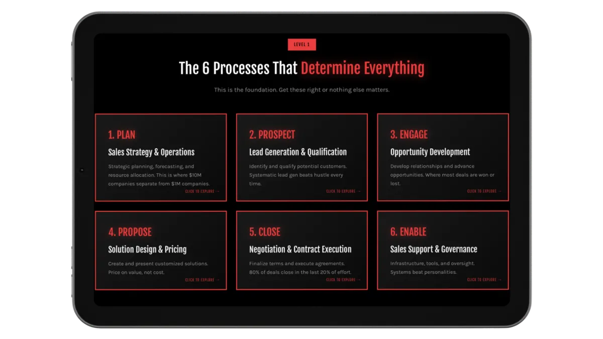 A Sales System is a finely tuned machine that transforms founder-led chaos into scalable, repeatable revenue — one your team executes confidently, predictably, and independently. You'll go from "sales happens because of me" to "sales happens because of our system."